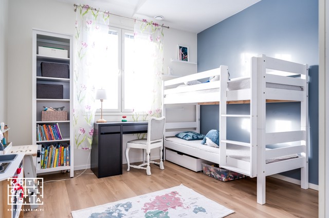 - Kaikissa makuuhuoneissa samat materiaalit, lukuunottamatta yhtä, jossa seinät tapetoitu. Kaikissa makuuhuoneissa kaapistot.