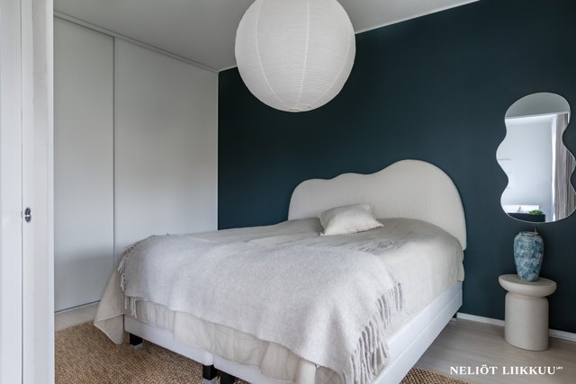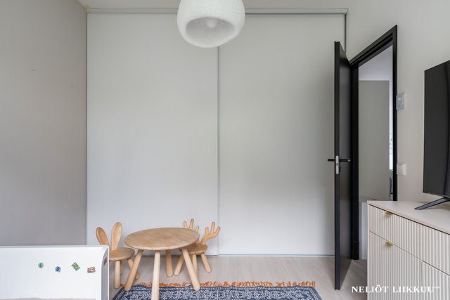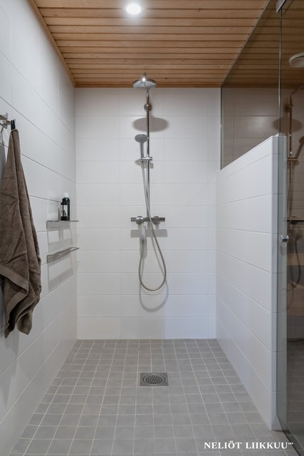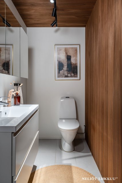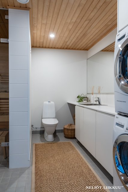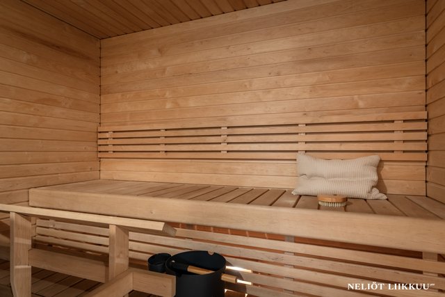 Saunatilat huokuvat rauhaa ja laatua, ja kodin päämakuuhuoneet sijaitsevat omassa rauhassaan. Säilytystilaa on runsaasti: korkeiden liukuovikaapistojen lisäksi asunnossa on lämmin varastohuone omalla sisäänkäynnillä, joka soveltuu myös etätyöpisteeksi, sekä erillinen ulkovarasto.