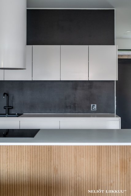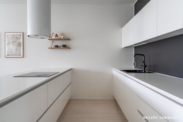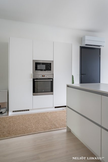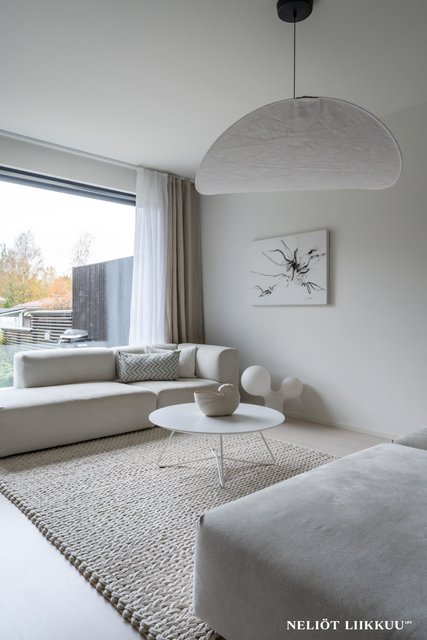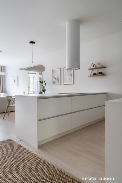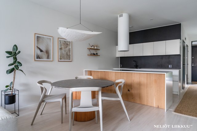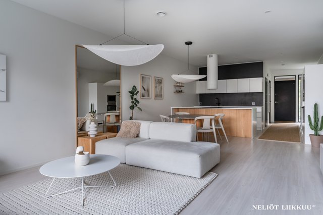 Asunnon sydämen muodostavat upeat ja avarat oleskelutilat, joissa saarekkeellinen avokeittiö kutsuu kokkailemaan ja viettämään aikaa yhdessä. Suuret ikkunat ja tarkkaan harkitut materiaalivalinnat tuovat valoa ja lämpöä arkeen.