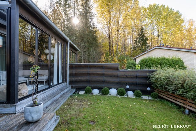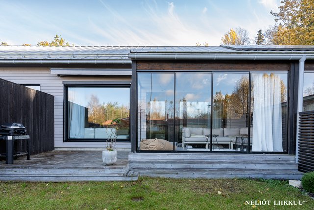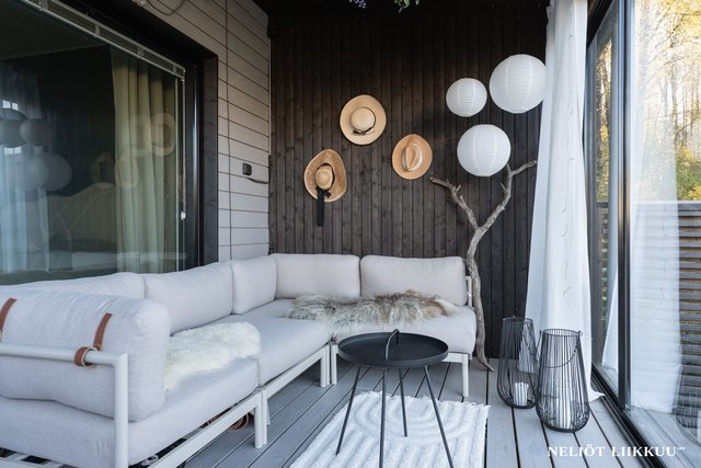 Aurinkoiset terassit avautuvat etelän ja lännen suuntaan – nauti auringosta aamukahvilta iltahetkiin saakka. Lasitettu terassi tarjoaa täydellisen paikan rentoutumiseen säästä riippumatta, ja avoterassi kutsuu grillaamaan ja viettämään iltoja ystävien seurassa.