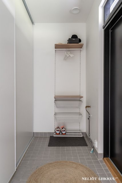 - Pieni ulkovarasto, erillinen yhteinen varasto pyörille jne. Asunnossa kaksi sisäänkäyntiä, jossa toisessa on kura-eteinen jossa säilytystilaa/varastoa. Muutoin molemmissa makuuhuoneissa isot liukuovikaapistot ja eteisessä kaapistot