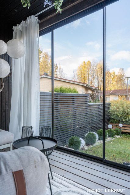 - Lasitettu terassi ja avoterassilla sähköllä toimiva markiisi.