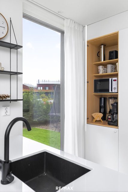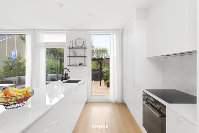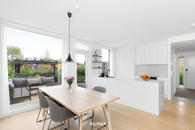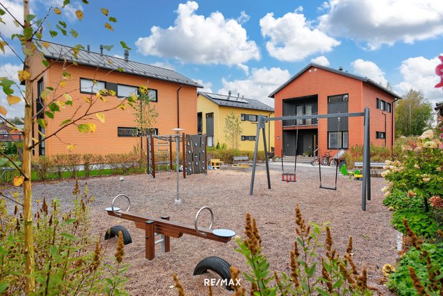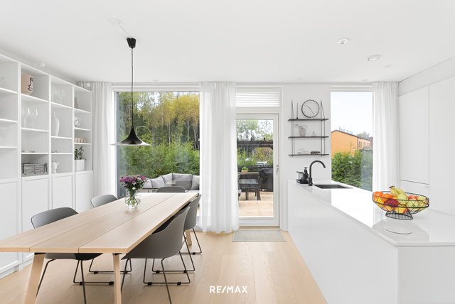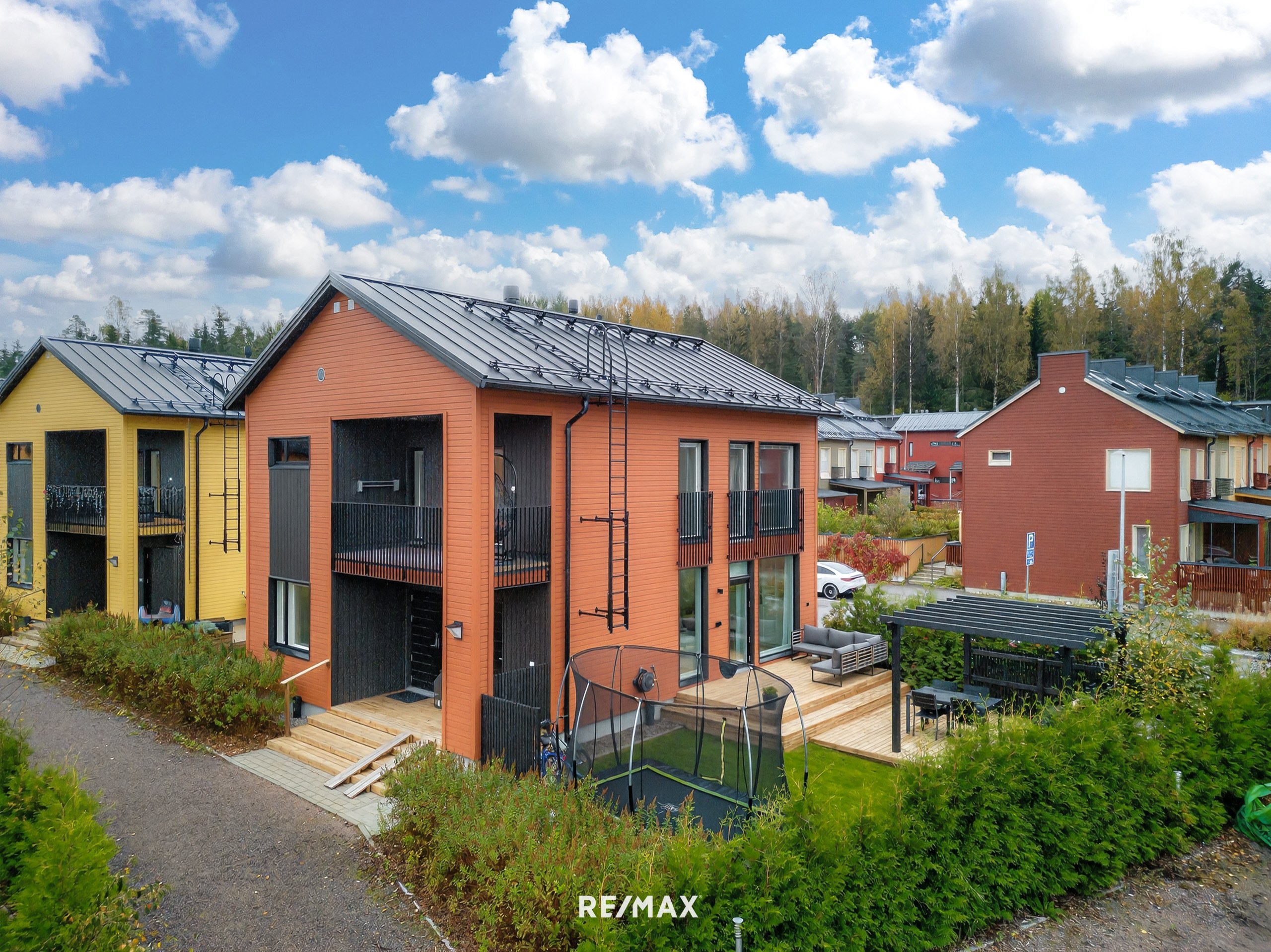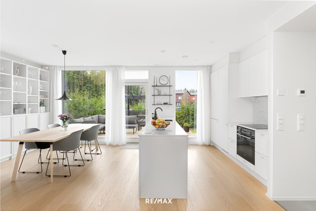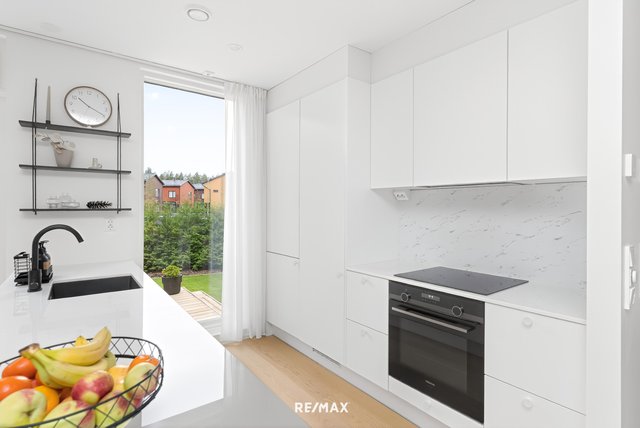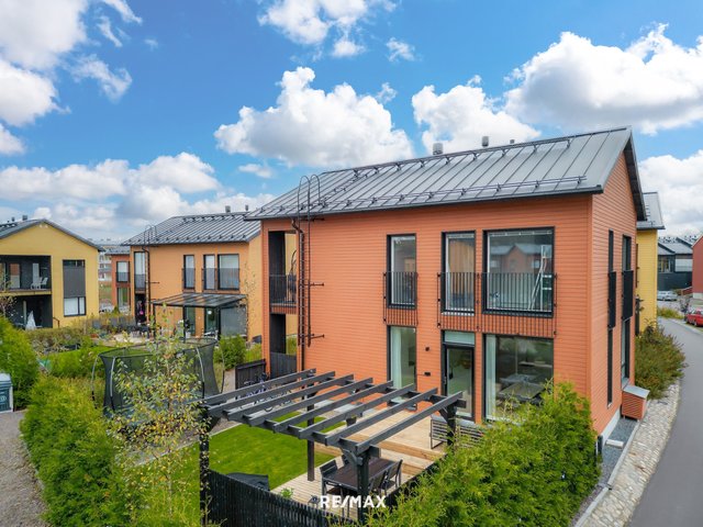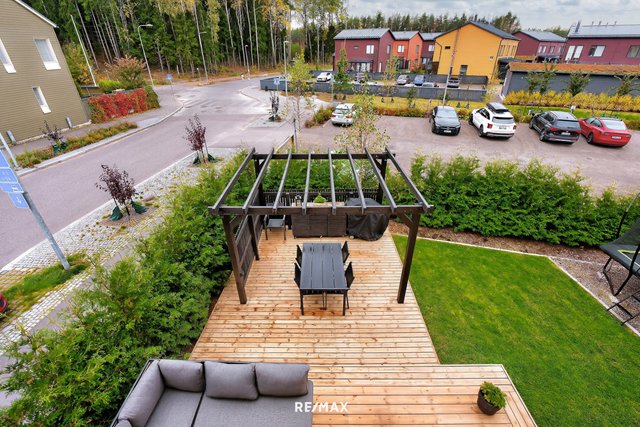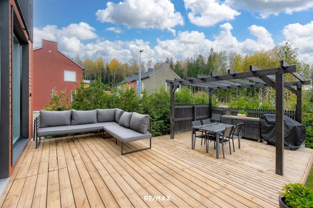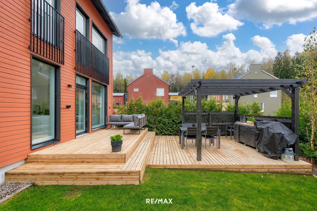 Keittiö täyttää vaativankin kotikokin tarpeet. Ruokailutilasta on käynti omalle terassille, jossa kesäkeittiö ja pergola kutsuvat viettämään aikaa ulkona. Suojaisa piha on täydellinen leikkipaikka lapsille ja rentoutumispaikka aikuisille.