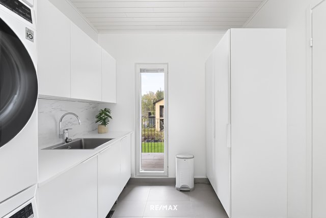 - Ikkunallinen kodinhoitohuone on kylpyhuoneen yhteydessä, jossa on paljon säilytystilaa.