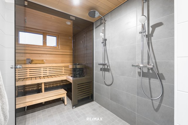 - Yläkerran kylpyhuoneen yhteydessä sauna ja kodinhoitotila.