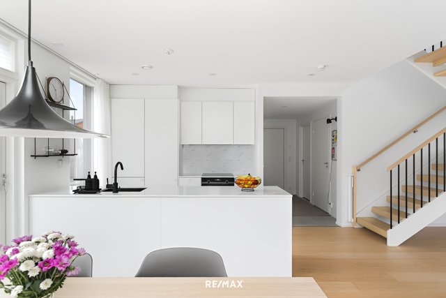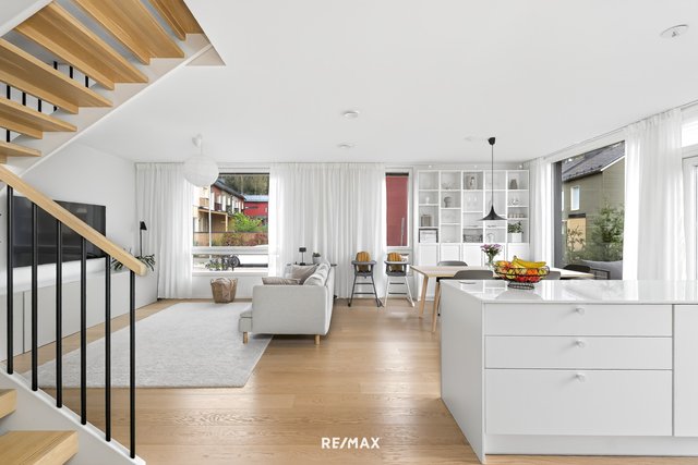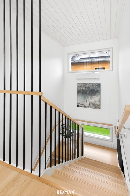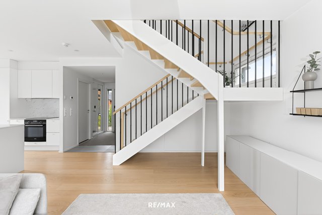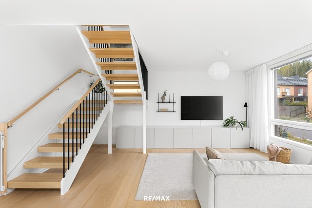 - Olohuoneesta tyylikkäät portaat yläkertaan: mustat metallipinnat, käsijohteet- ja askelmat tammea. Asumismukavuutta lisää viilentävä ilmalämpöpumppu.