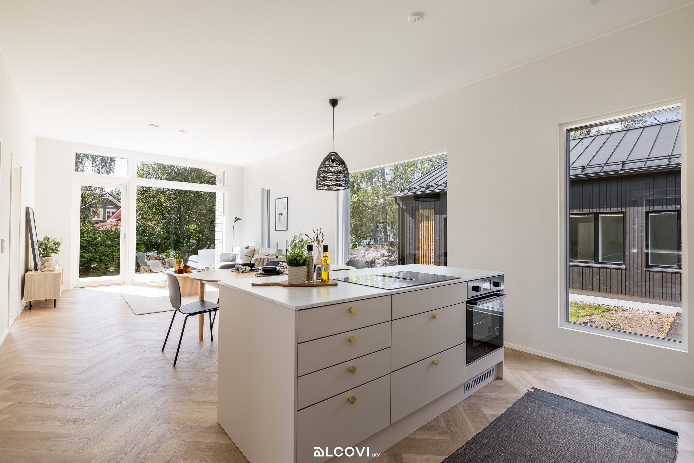 - Avokeittiön (Topi-Keittiöt) varustukseen kuuluvat Electrolux-merkkiset integroidut kodinkoneet: induktioliesitaso integroidulla liesituulettimella, kalusteuuni, mikroaaltouuni, astianpesukone, jääkaappi ja pakastin. Hana: Tapwell, Arman ARM 885, ulosvedettävä juoksuputki, sävy Matte Black, allas: Lapetek. Työtaso on laminaattia. Lattia on kalanruotovinyyliä, seinät maalatut. Lattialämmitys (vesikiertoinen). Katossa upotetut led-spotit.