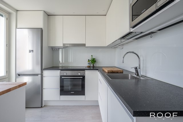 - Moderni vaalea keittiö integroiduin kodinkonein. Flash Black -laminaattitaso, välitilassa taustamaalattu lasi. Gustavsberg Nautic -hana, Lapetek Luna -allas. Maalatut seinät, laminaattilattia.
