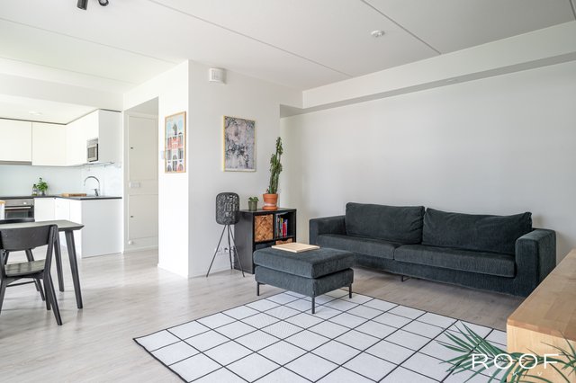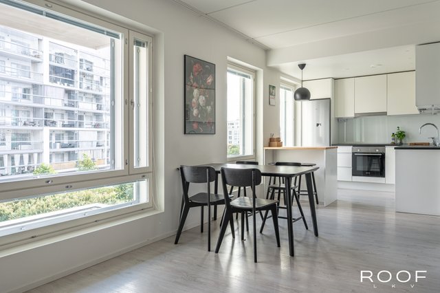 Asunnon sydän on valoisa ja avara olohuoneen, ruokailutilan ja keittiön muodostama oleskelutila, jonka suuret ikkunapinnat avaavat näkymän sisäpihan puolelle. Vaalea Puustellin keittiö on varustettu integroiduilla kodinkoneilla ja tarjoaa erinomaiset puitteet ruoanlaittoon ja yhdessäoloon.