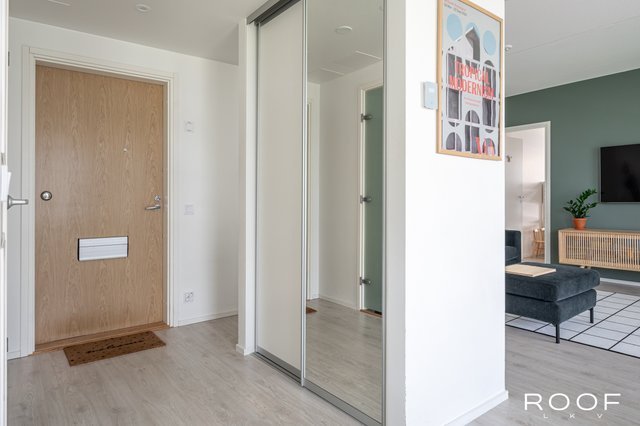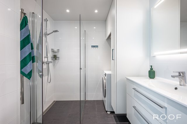 Eteisestä on käynti tilavaan kylpyhuoneeseen, jossa on hyvin tilaa myös perheen pyykkihuollolle. Koko asunnon kattava vesikiertoinen lattialämmitys takaa tasaisen lämmön ja vapauttaa seinäpinnat sisustukselle. Säilytystilaa tarjoavat makuuhuoneiden ja eteisen liukuovikaapistot, jotka on varustettu laadukkailla Elfa-sisusteilla.