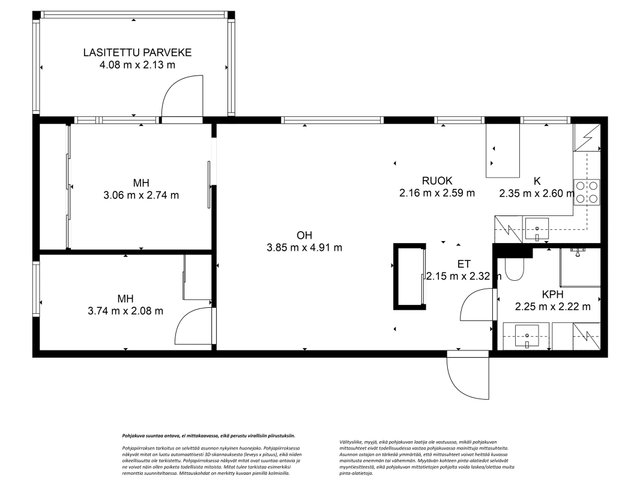 - Huoneiston pinta-ala on yhtiöjärjestyksen, isännöitsijäntodistuksen ja myyjän ilmoituksen mukaan 59,00 m2. Kohteen markkinoinnissa käytetään mittatiedoilla varustettua pohjapiirrosta. Pohjapiirroksen tarkoitus on helpottaa ostajan ostopäätöstä ja selvittää asunnon nykyinen huonejako. Lukija on tietoinen, että pohjakuva on suuntaa antava, ei mittakaavassa, eikä perustu virallisiin piirustuksiin. Pohjapiirroksessa näkyvät mitat ovat suuntaa antavia ja ne voivat näin ollen poiketa todellisista mitoista. Välitysliike, myyjä, eikä pohjakuvan laatija ole vastuussa, mikäli pohjakuvan mittasuhteet eivät todellisuudessa vastaa pohjakuvassa mainittuja mittasuhteita.
