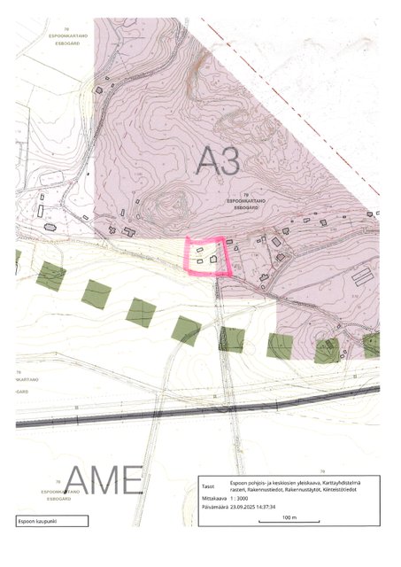 - Poikkeamispäätöstä / suunnittelutarveratkaisua haettava alue yleiskaavan mukaan A 3. Rakennusoikeus asunnolle 300 k-m² + 60 k-m² talousrakennuksille
