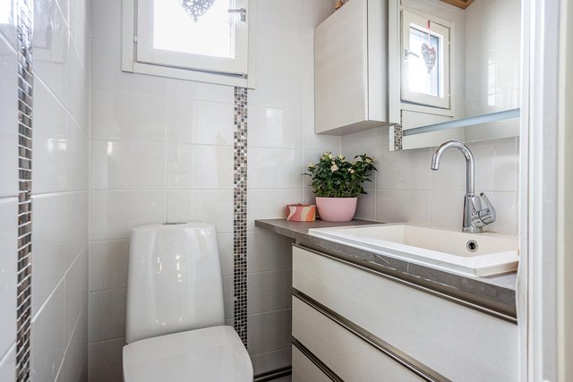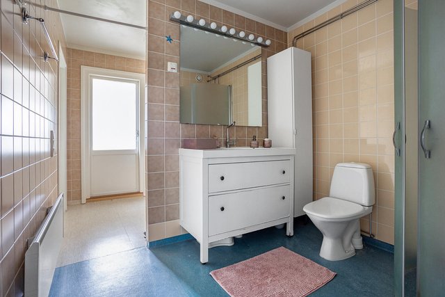 - Suihkuseinä, suihku, wc-istuin, peili, allaskaappi, ja pesuallas