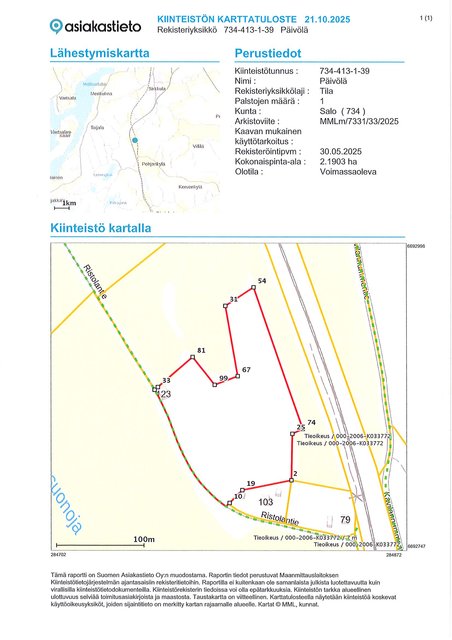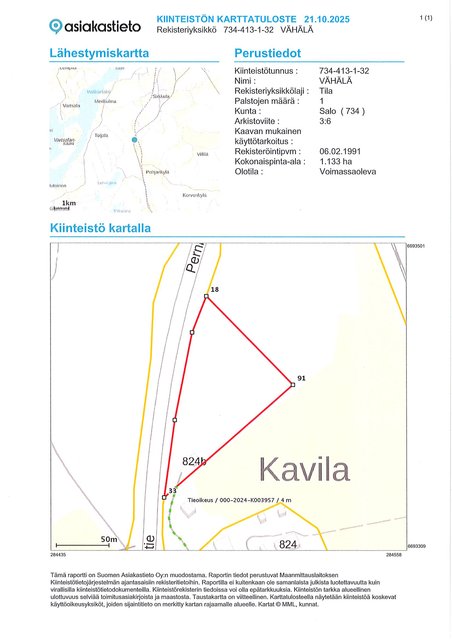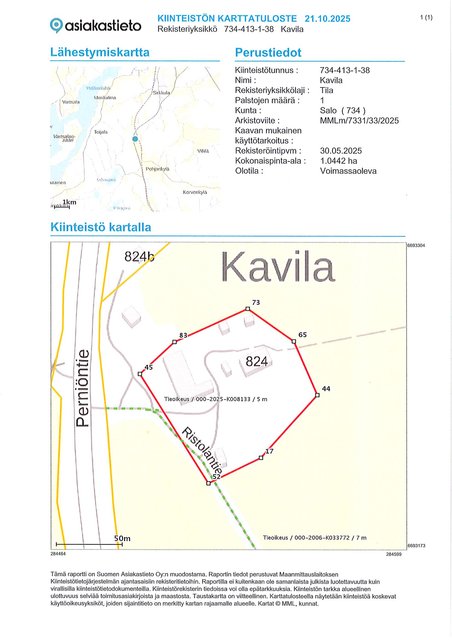 - Kolme eri kiinteistöä: * Kavila -niminen tila 734-413-1-38 osoitteessa Perniöntie 824 * Päivölä -niminen tila 734-413-1-39 osoitteessa Ristolantie 123 * Vähälä -niminen tila 734-413-1-32 osoitteessa Perniöntie 824 B