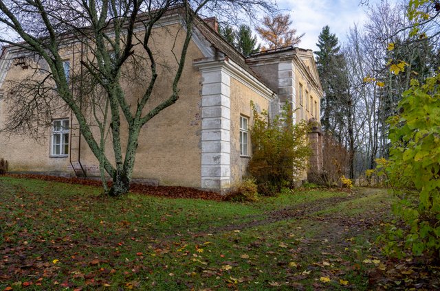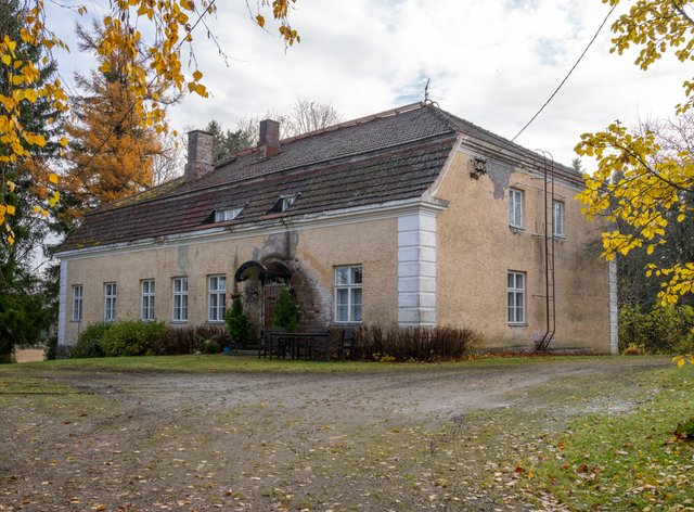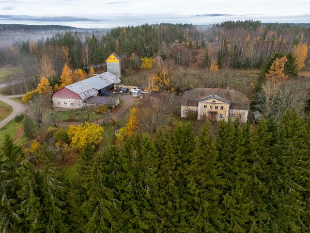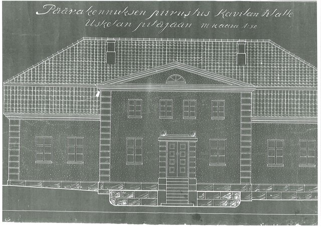 Historiallinen, kartanotyyppinen päärakennus, jossa tiilirunko ja rapattu ulkoverhous.