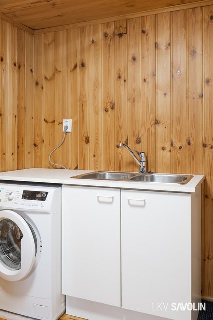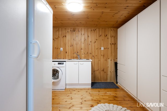 - Pesukoneliitäntä, kaapistot sekä pakastinkaappi, ja tila pesutornille