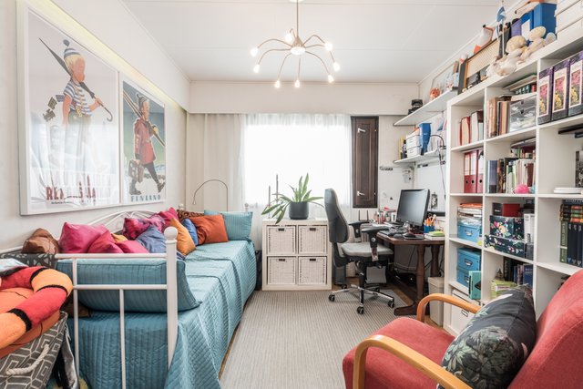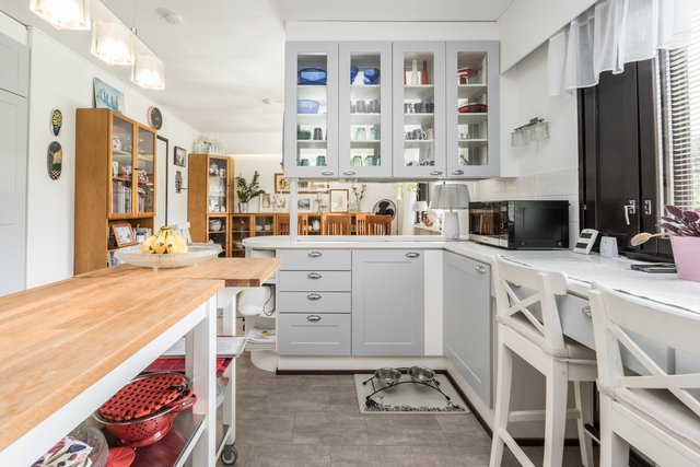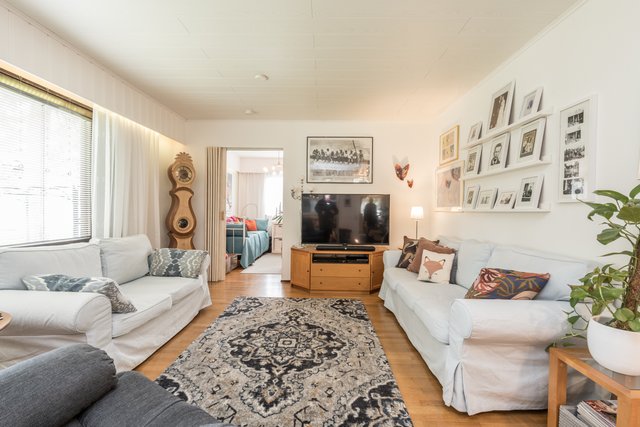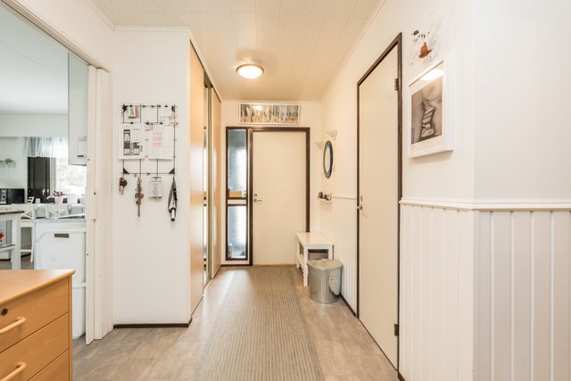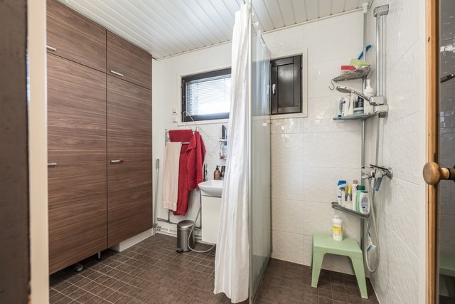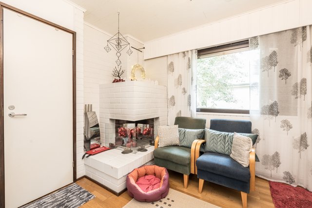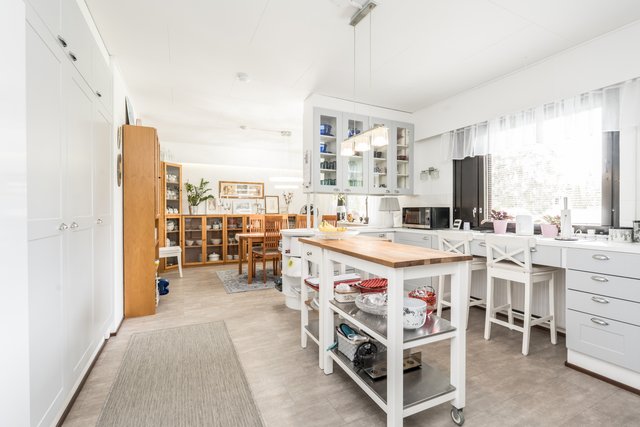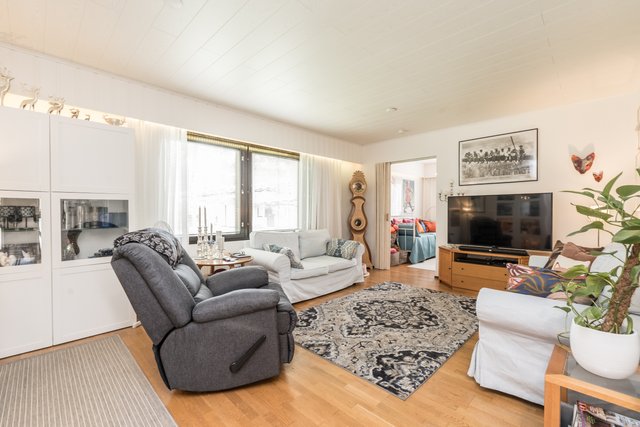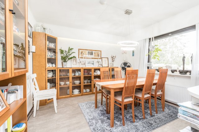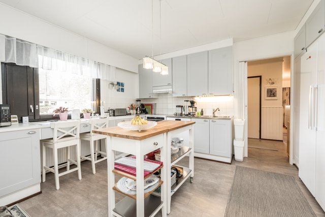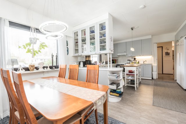 Todella tilava, valoisa ja vaaleasävytteinen keittiö, jossa on paljon kaappi- ja laskutilaa. Keittiön vieressä on ruokailuhuone, joka on auki keittiöön, joten yhteistä toimivaa tilaa, vaikka seurusteluun on runsaasti. Tilava olohuone, kaksi makuuhuonetta, takkahuone, tyylikkäästi kaakeloitu tilava kylpyhuone (uusittu 2020), jossa hyvin tilaa myös kodin pyykkihuoltoon. Oma tunnelmallinen sauna, vaatehuone, eteinen ja erillinen wc kuuluvat myös tähän asuntoon. Autotalli ja varasto ovat myös osana tätä kokonaisuutta. Talossa on tehty paljon parannuksia viimevuosina.
