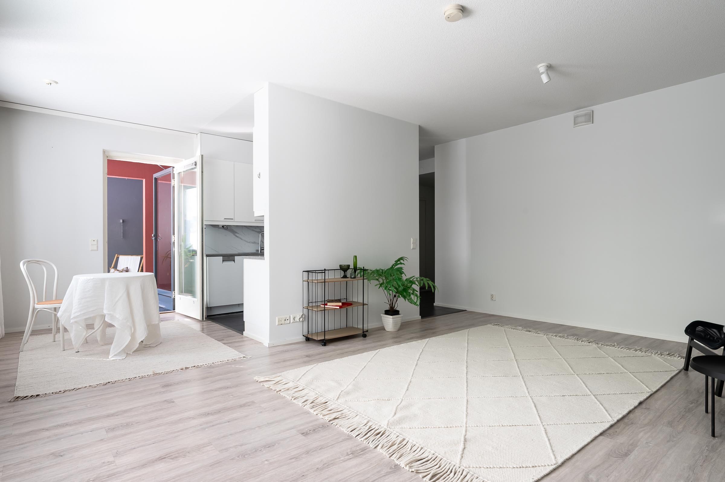 Moderni keittiö tarjoaa erinomaiset puitteet ruoanlaittoon. Avaran eteisen ja keittiön lattia on tyylikästä ja käytännöllistä grafiitinharmaata laattaa. Keittiön päädyssä ikkunan alla on tila isolle ruokapöydälle. Ruokailutilasta on käynti mahtavan isolle lasitetulle parvekkeelle, joka jakaantuu kahteen osaan. Olohuoneen vinyylilattia ja harmaa-valkoiset seinät luovat tyylikkään ja ajattoman ilmeen. Makuuhuoneessa on runsaasti säilytystilaa seinän levyisten kiinteiden kaapistojen ansiosta.
