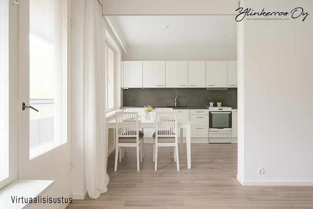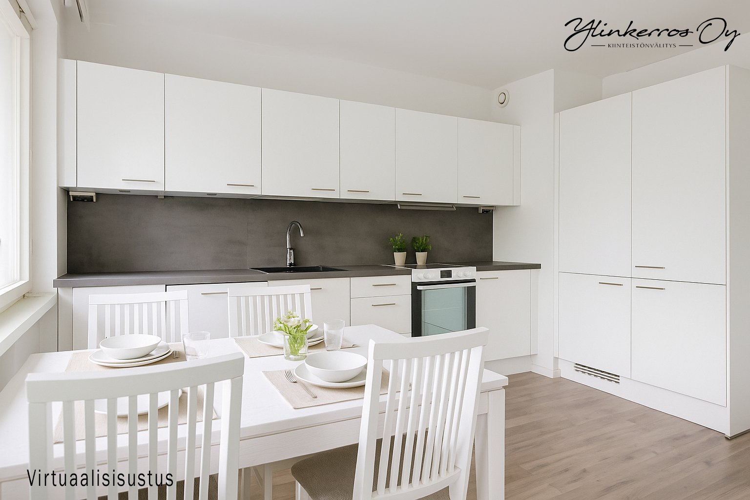 - Mahtavan kokoinen keittiö, jossa tilaa on runsaasti niin säilytykseen ja ruoanlaittoon kuin suuremmallekin illallisseurueelle tai sukujuhlille. Runsaat kaapistot komeilevat valkoisen värissä ja kaapistotilaa on sijoitettu kahdelle seinälle. Näistä puitteista löytyy säilytystilaa innokkaammallekin kokille. Kaapistojen kätköihin on myös piilotettu jääpakastinkaappi, astianpesukone sekä liesituuletin, jonka ansiosta keittiön ilme on ihanan rauhallinen. Keittiössä on varusteena lisäksi keraaminen liesi.