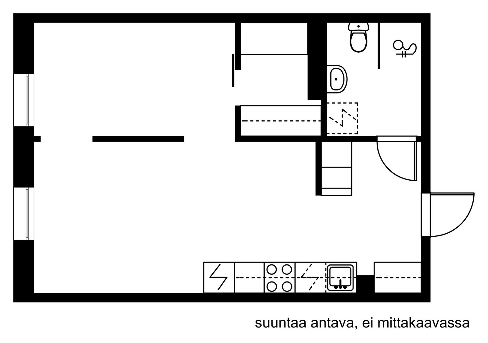 - Suihkuseinä, allaskaappi, pesukoneliitäntä, peilikaappi, wc-istuin, suihku, ja kiinteät valaisimet
