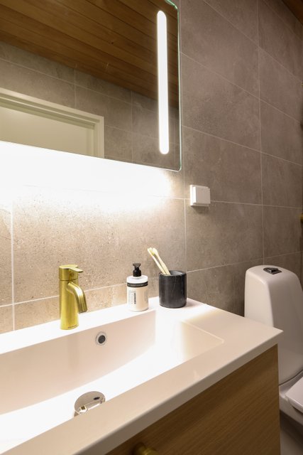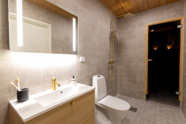 Asunnossa oma sauna, jossa voit rentoutua pitkän ulkoilupäivän jälkeen. Saunan yhteydessä on myös modernisti varusteltu kylpyhuone tyylikkäillä yksityiskohdilla.