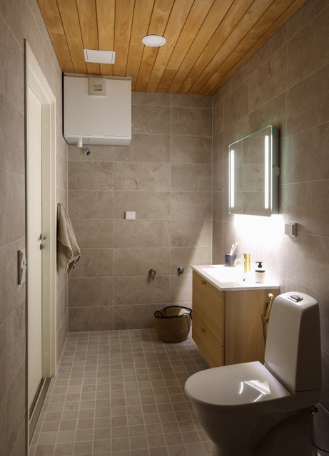 - WC-istuin, suihku, pesukoneliitäntä, pesuallas, allaskaappi, ja peili