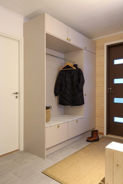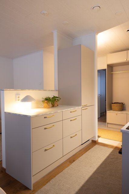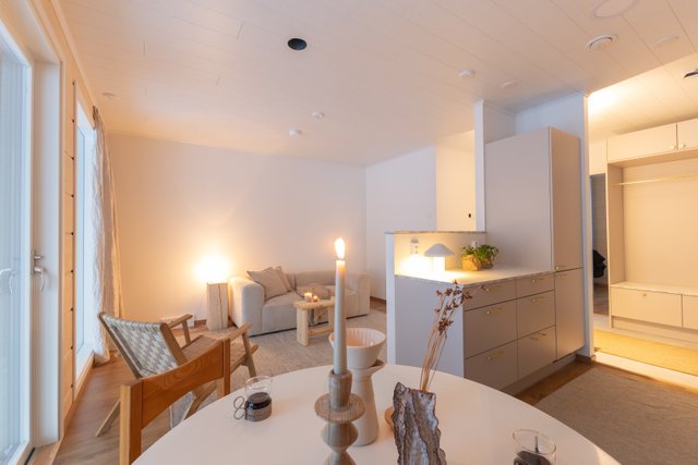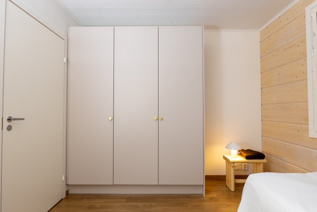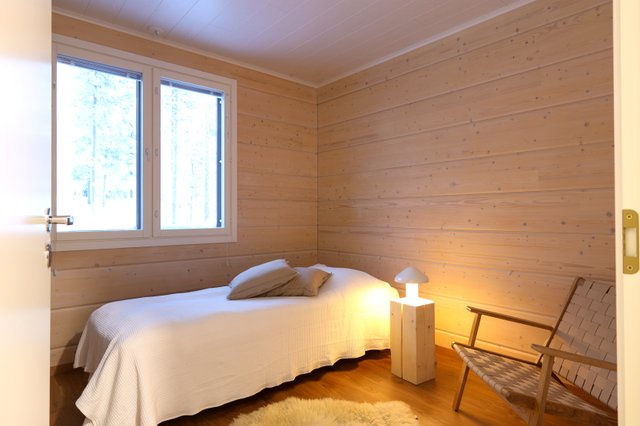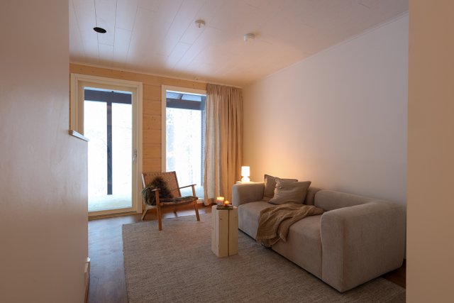 Asunnon lattiamateriaalina on kestävä laminaatti ja seinät yhdistävät maalin ja hirsipinnan tuoden luonnonläheisen tunnelman sisustukseen. Keittiö on varustettu nykyaikaisilla kodinkoneilla ja keittiösaarekkeella, mikä tekee ruoanlaitosta nautinnollista. Makuuhuoneessa yhdistyvät niin ikään tyylikkäät pintamateriaalit ja hirsiseinät, luoden rauhallisen lepohetken.