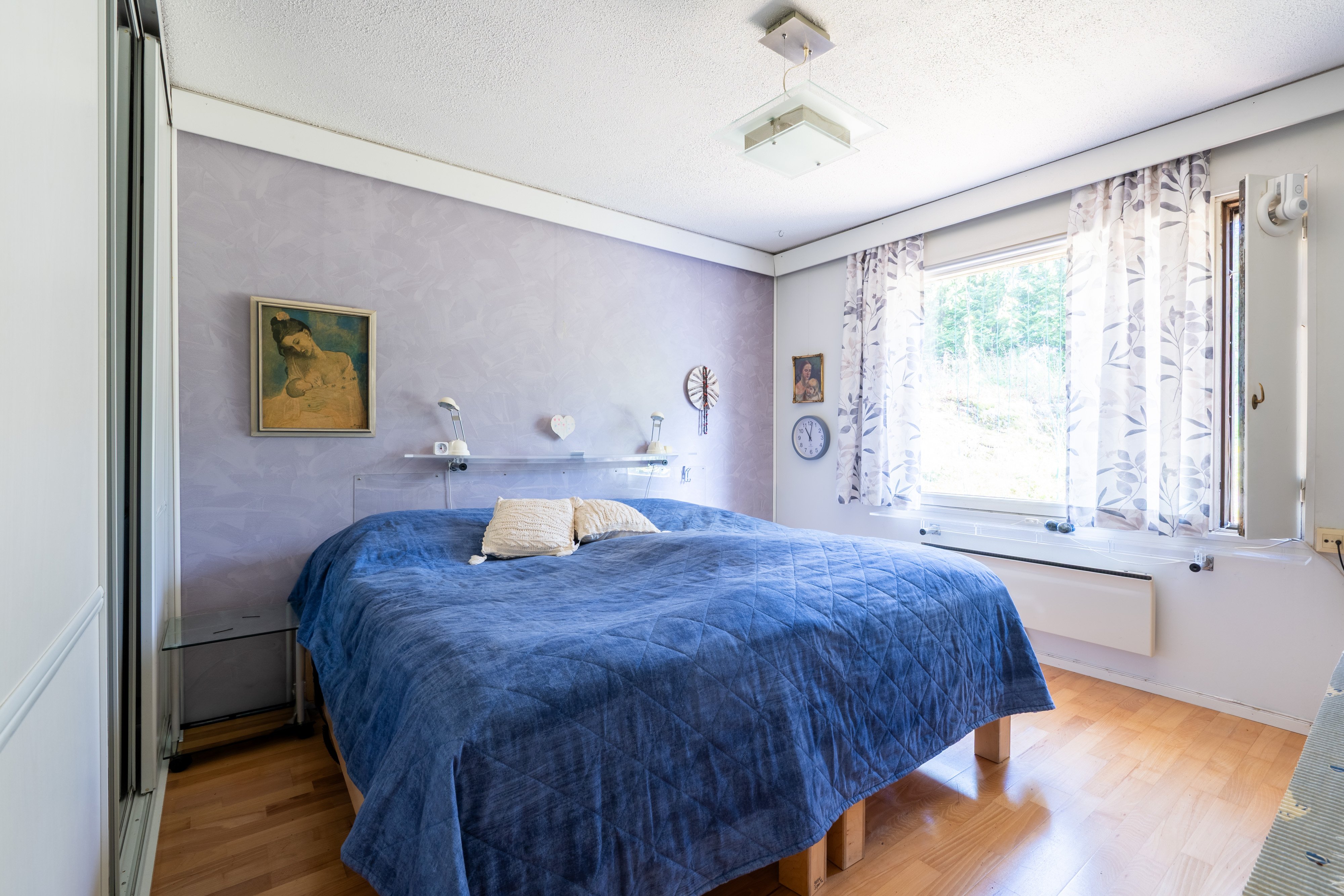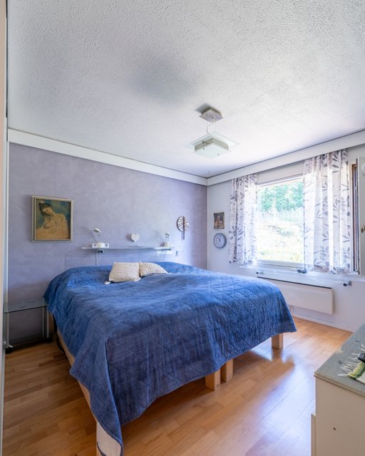 - Tilava ja valoisa makuuhuone, poistoilmapuhaltimella ja parkettilattialla. Olohuoneen yhteyteen avatussa makuuhuoneessa laminaattilattia.