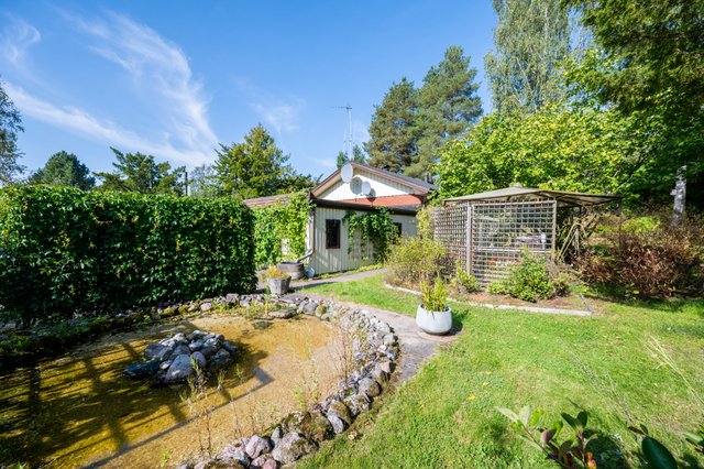 Puutarha on kauniisti hoidettu ja sieltä löytyy kesämaja, vesiaihe sekä viherhuone, jossa on sauna ja oleskelutilat. Hyötykasveista pitävät löytävät ilokseen omenapuita, marjapensaita sekä istutuslavoja.