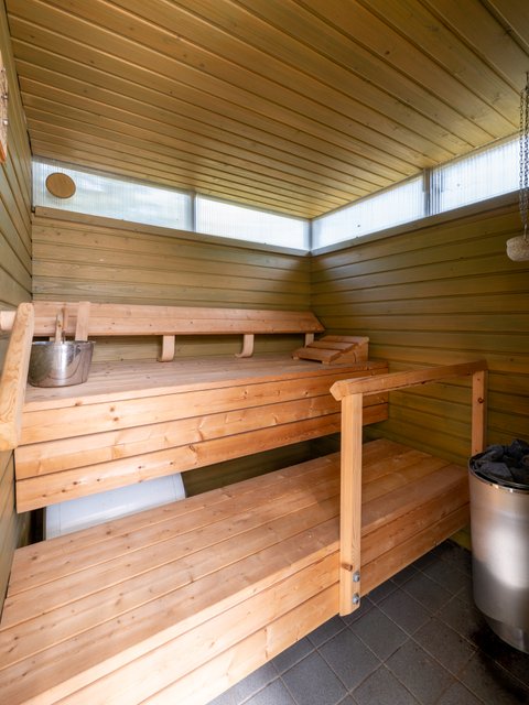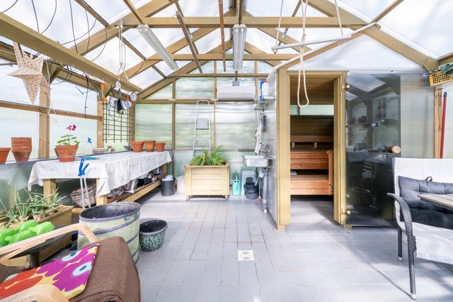 - Sauna viherhuoneessa, jossa mukavat oleskelutilat.