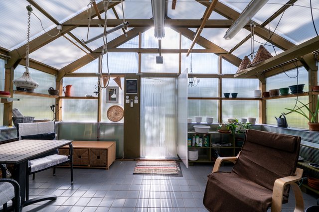 Myös viherhuone on varustettu niin lattialämmityksellä kuin ilmalämpöpumpulla, joten se on käytettävissä läpi vuoden.