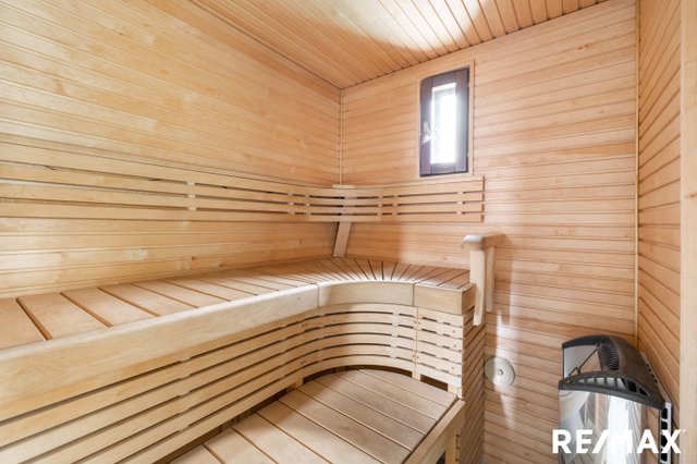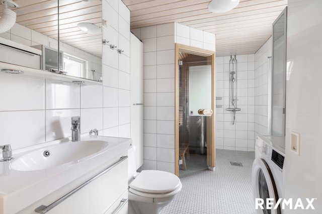 The house's sauna is the perfect place to relax, and its electric heater ensures pleasant steam baths. The bathroom has underfloor heating, which brings comfort on cool mornings. In addition, the house has a convenient walk-in closet and outdoor storage.