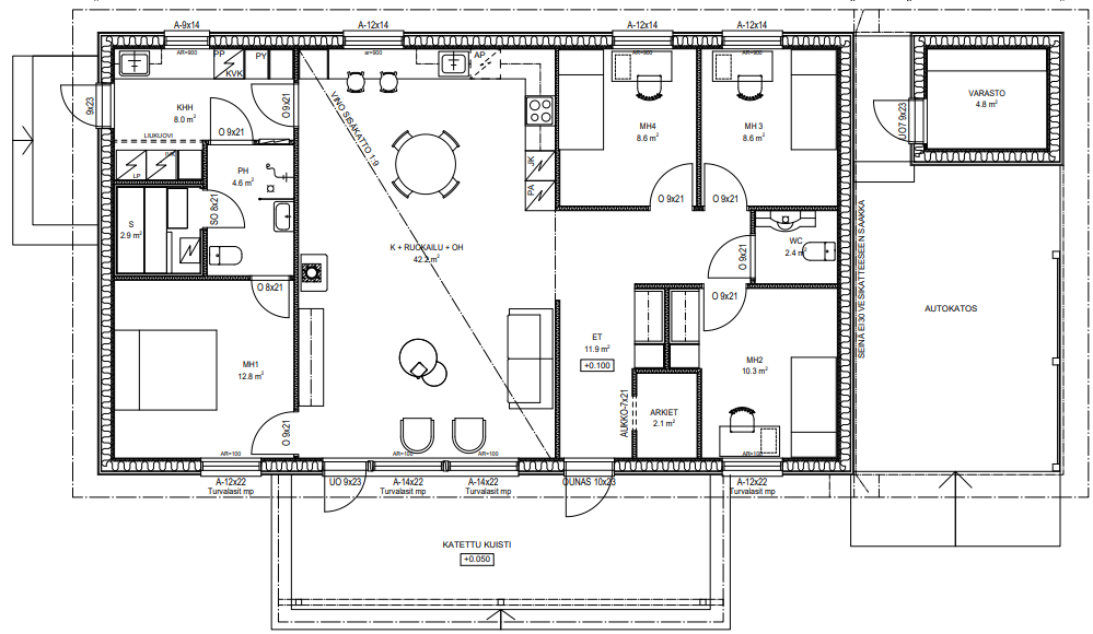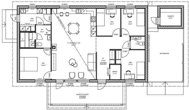 - Huoneistoala 119m², varasto 4,8m², kerrosala 143m². Pinta-alatiedot rakennuspiirustuksista.