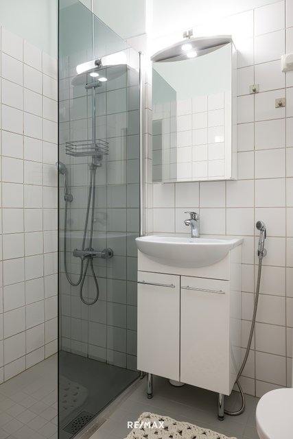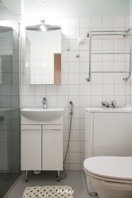 - WC-istuin, suihku, suihkuseinä, pesukoneliitäntä, peilikaappi, pesuallas, allaskaappi, ja bidee-suihku