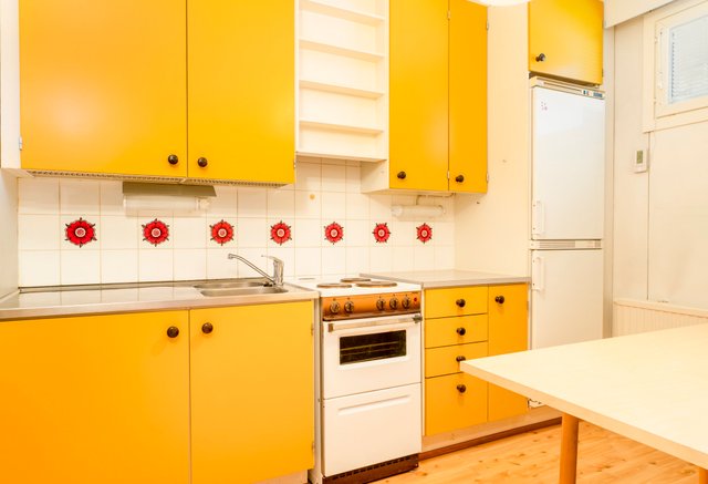 - Jääkaappipakastin, mikroaaltouuni, ja liesi