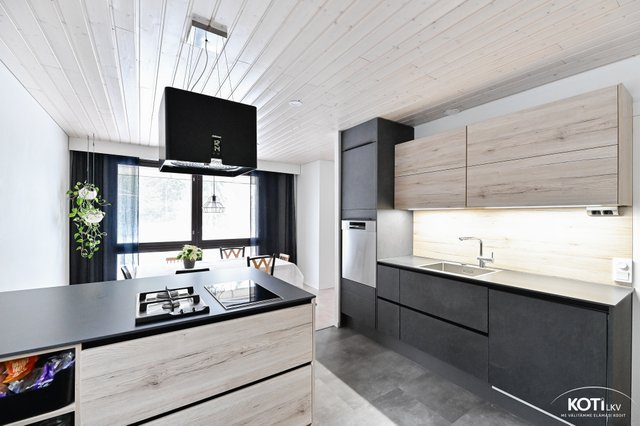 - Jääkaappi, erillinen pakastin, erillisuuni (pyrolyysi), liesi, liesituuletin, mikroaaltouuni, astianpesukone, ja keittiösaareke