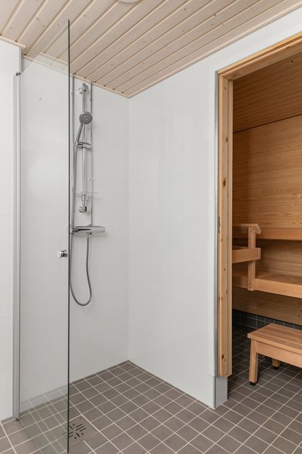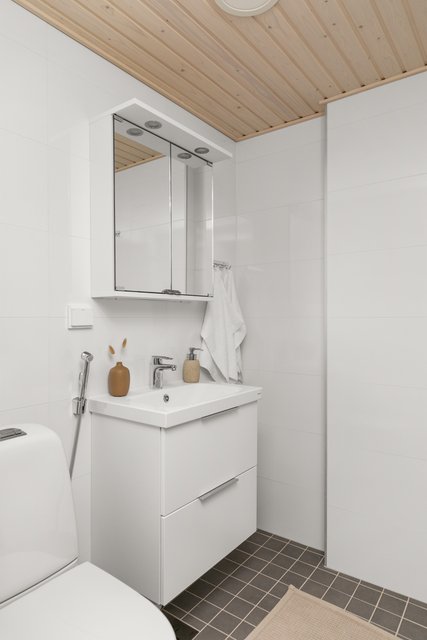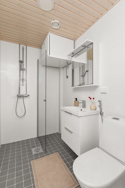 - Allaskaappi, peilikaappi, suihkuseinä, wc-istuin, suihku, pesukoneliitäntä, lattialämmitys, bidee-suihku, ja pesuallas