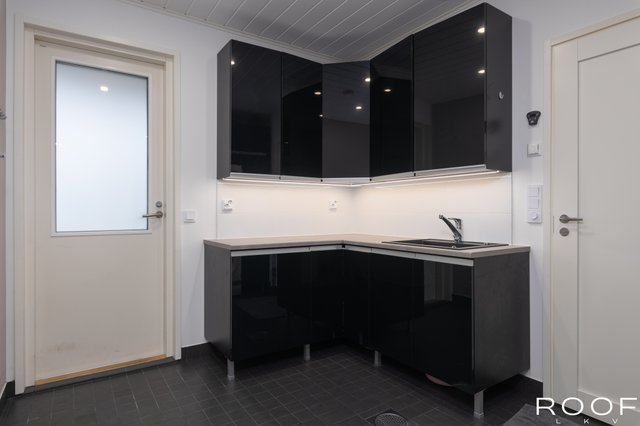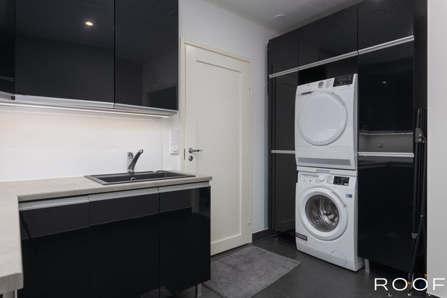 - Lattialämmitys, lattiakaivo, pyykkikaapit, pöytätaso, ja tila pesutornille