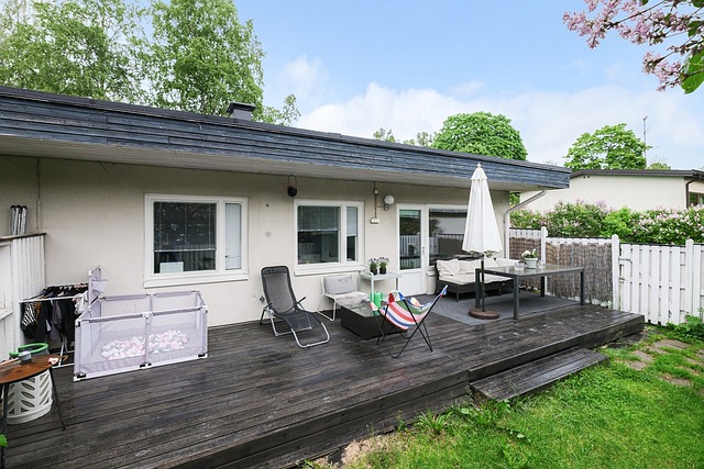 Huoneiston suojaisa ja tilava piha-alue antaa etelään. Pihalla on myös terassi, joka on osittain katettu. Piha on aidattu, joten omaa rauhaa riittää. Pihalla on pihavaja, joka antaa lisää säilytystilaa.