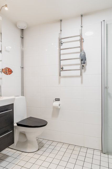 - Suihku, suihkuseinä, pesukoneliitäntä, lattialämmitys, peilikaappi, pesuallas, allaskaappi, bidee-suihku, ja pyyhepatteri