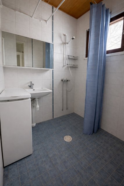 - Suihku, pesukoneliitäntä, peilikaappi, ja pesuallas