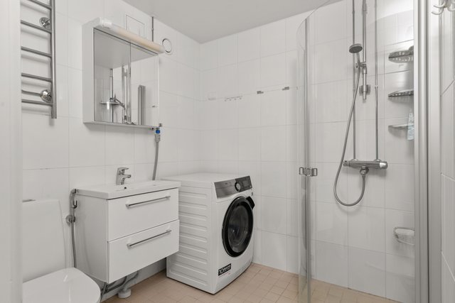 - WC-istuin, suihku, suihkuseinä, pesukoneliitäntä, pesuallas, peilikaappi, ja lattialämmitys