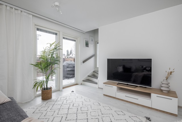 - Olohuone on tämän kodin sydän – avara, valoisa ja kutsuva. Suuri, lähes lattiasta kattoon ulottuva päätyikkuna tuo runsaasti luonnonvaloa sisään ja korostaa tilan avaruutta. Ikkunan kautta avautuu näkymä omalle pihalle, ja olohuoneesta on suora käynti tilavalle pihaterassille, joka jatkaa oleskelutilaa ulos saakka. Sisustuksessa on panostettu selkeyteen ja vaaleisiin sävyihin: seinät on maalattu hillitysti ja lattia on vaaleaa laminaattia, joka tuo tilaan raikkautta ja modernia ilmettä. Tämä olohuone tarjoaa täydelliset puitteet niin rentoutumiselle kuin yhdessäololle – olipa kyseessä arki tai juhla.