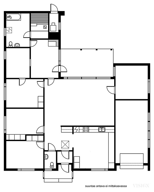 - Pinta-alatiedot on rakennuspiirustuksista, eikä niitä ole tarkistusmitattu, joten ne saattavat poiketa olennaisestikin nykymääräysten mukaan mitattavista pinta-aloista. Rakennusvalvontaviranomaisen kerrosalatieto rekisterissä on 205 m² ja huoneistoala 150 m².