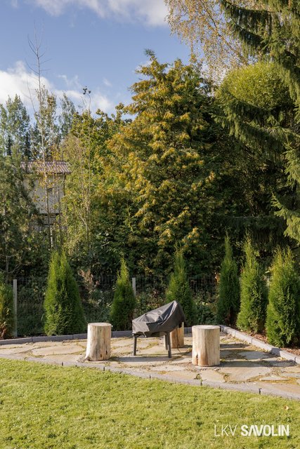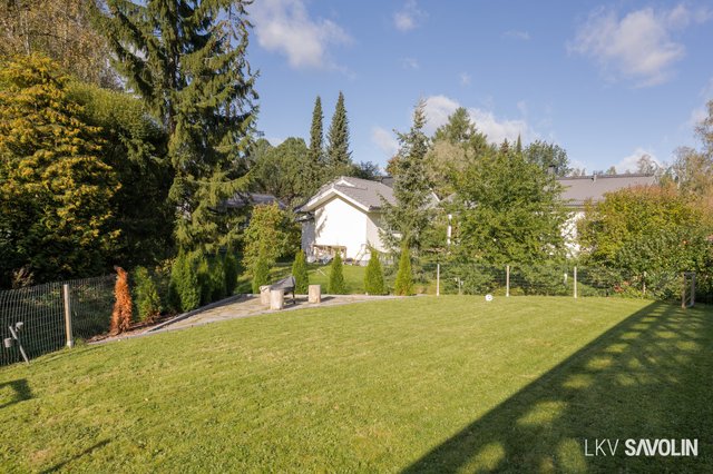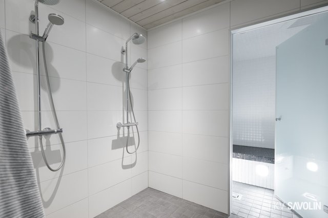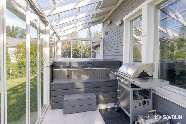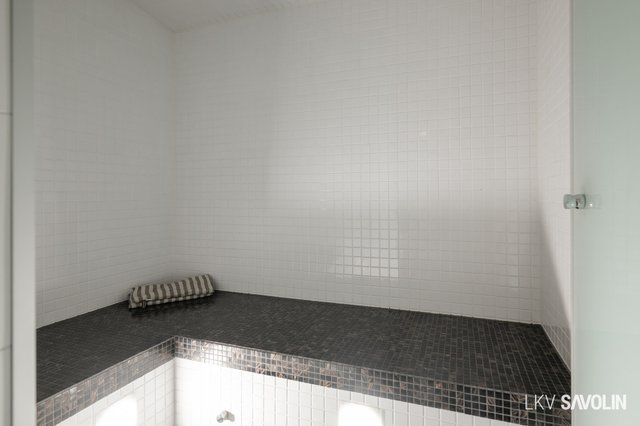 Kylpyhuoneessa on tuplasuihkut, lattialämmitys sekä ylellinen höyrysauna rentoutumishetkiin. Lisäksi iso lasitettu terassi toimii olohuoneen jatkeena pitkälle syksyyn. Terassilla on poreamme, joka tuo todellista luksusta arkeen. Aidattu piha tuo yksityisyyttä ja pihalta löytyy myös kylmä varasto sekä grillipaikka.