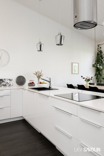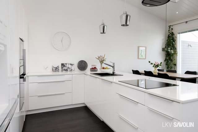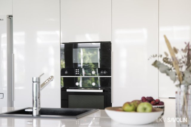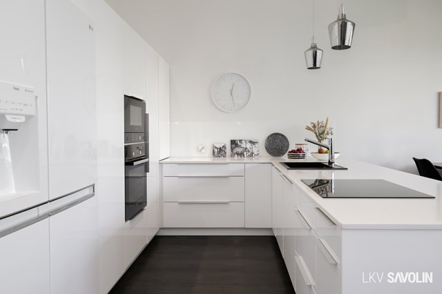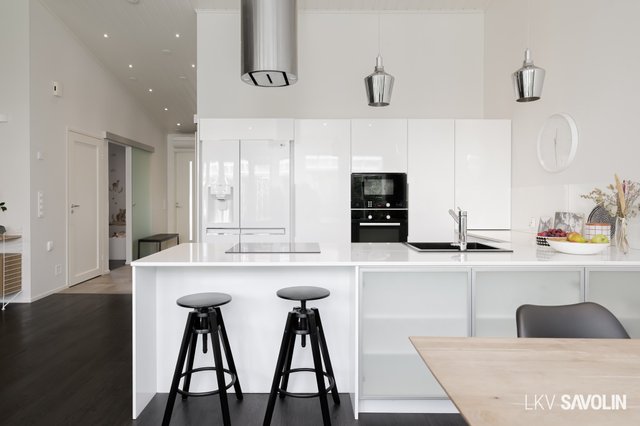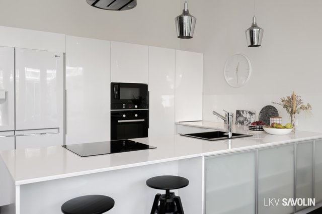 - Mikroaaltouuni, jääkaappi (jenkkikaappi side by side integroidulla jääpalakoneella), erillinen pakastin, uuni, liesi, liesituuletin, keittiösaareke, ja astianpesukone