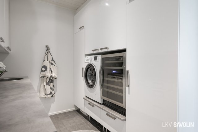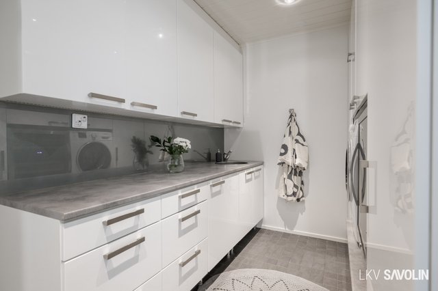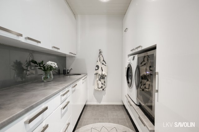 - Pesukoneliitäntä, lattialämmitys, pesuallas, lattiakaivo, silityspöytä/taso, pyykkikaapit, pöytätaso, keskuspölynimuri, ja tila pesutornille