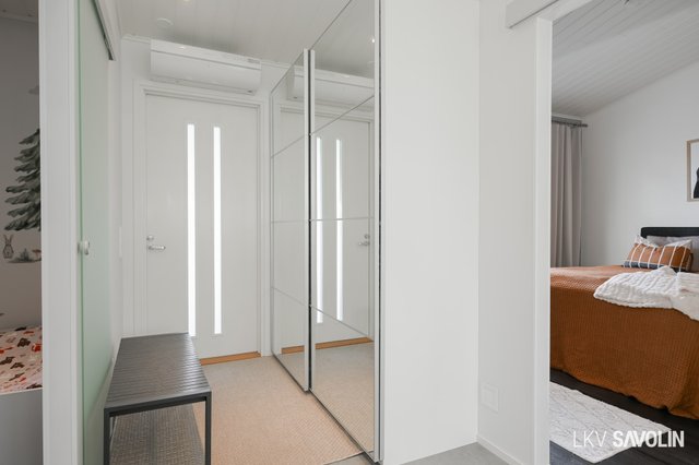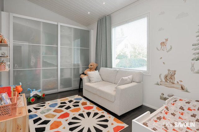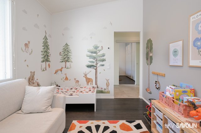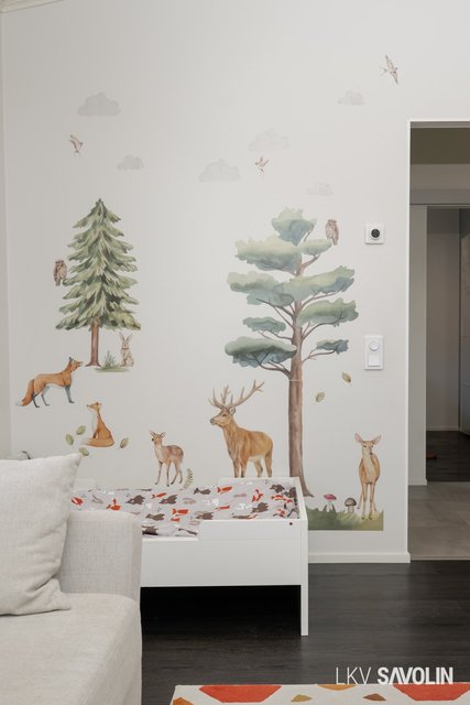 - Makuuhuoneidet koot 14 m2 ja 12,7m2. Molemmissa makuuhuoneissa on säilytystilaa. Lastenhuoneen seinätarrat ovat helposti poistettavissa.