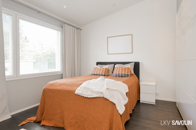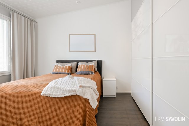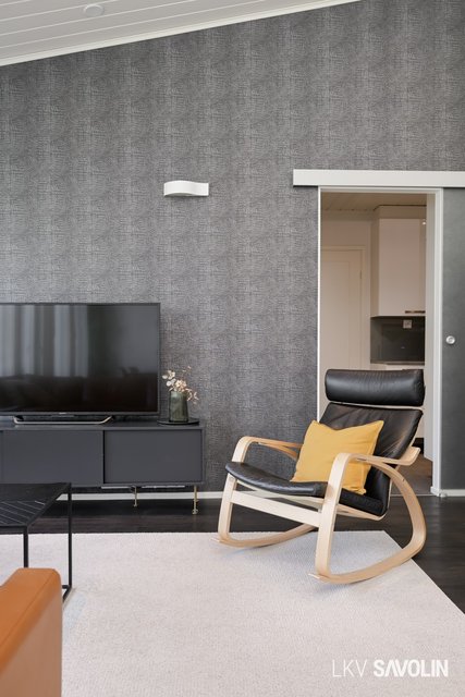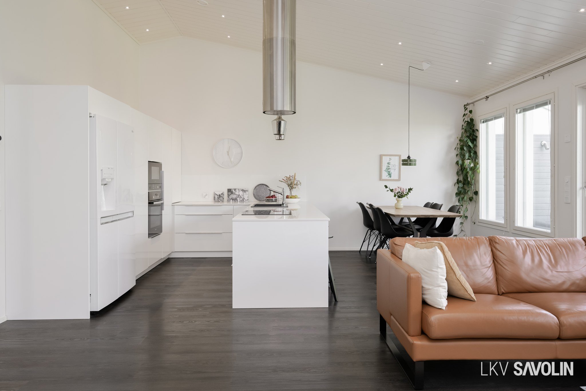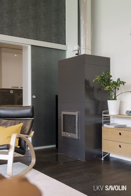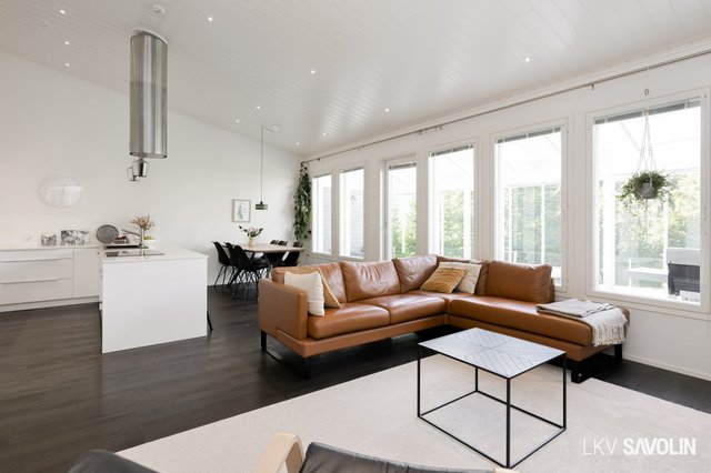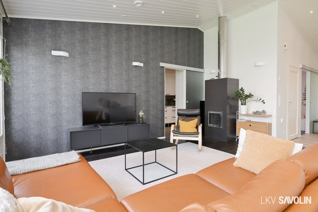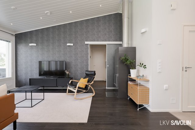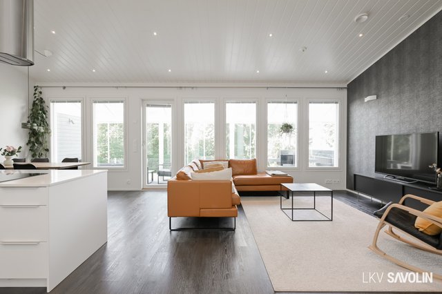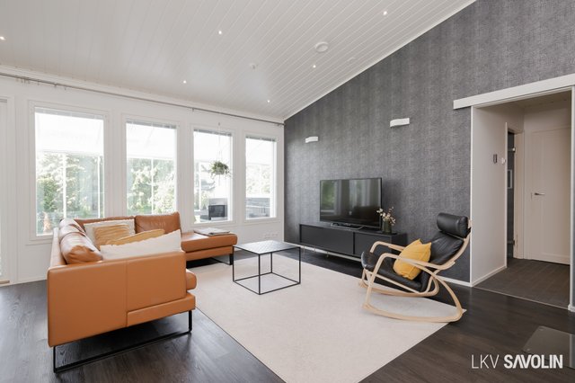 Kodin sydän on avara olohuone-keittiö, jossa korkea vino sisäkatto luo tilaan näyttävyyttä ja ilmavuutta. Suuret ikkunat tuovat luonnonvaloa. Olohuoneessa tunnelmaa ja lämpöä tuo varaava takka, ja keittiö on varusteltu laadukkailla ja moderneilla kodinkoneilla sekä tyylikkäillä vaaleilla kaapistoilla. Kodissa on kaksi tilavaa makuuhuonetta, joissa on mukavasti säilytystilaa.
