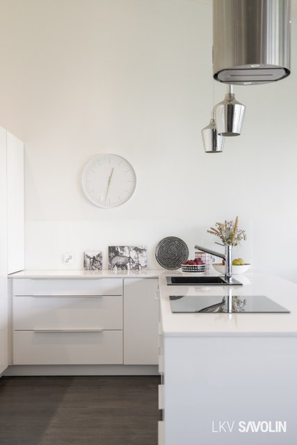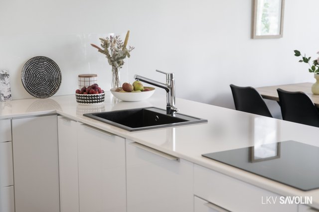 - Charmia-keittiö. Vaaleat tyylikkäät kaapistot. Reilusti säilytystilaa.